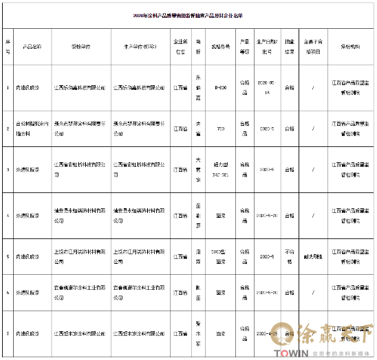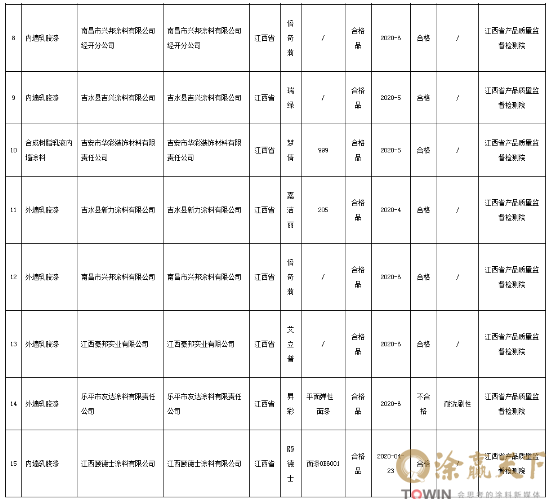 涂赢天下讯:据江西省市场监督管理局网站2020年12月31日消息,近期,江西省市场监督管理局对全省涂料产品质量进行了监督抽查。本次抽查了15批次产品,经检验,发现上饶市江月装饰材料有限公司、乐平市友达涂料有限责任公司等2家企业生产的2批次产品不合格。