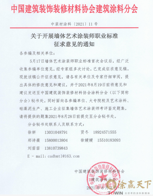 5月17日墙体艺术涂装师职业标准首次会议后,经广泛收集参编单位意见,经专家组多次讨论,已完成征求意见稿。现就该稿公开征求意见,请各有关单位及专家仔细审阅,提出具体的修改意见和建议,并于2021年8月19日前将意见和建议发送至中国建筑装饰装修材料协会建筑涂料分会(以下简称分会)秘书处。同时面向各参编单位、大专院校及艺术涂料硅藻泥生产、施工企业征集墙体艺术涂装师考评鉴定题集,请将提供的题集于2021年8月28日前提交至分会秘书处。