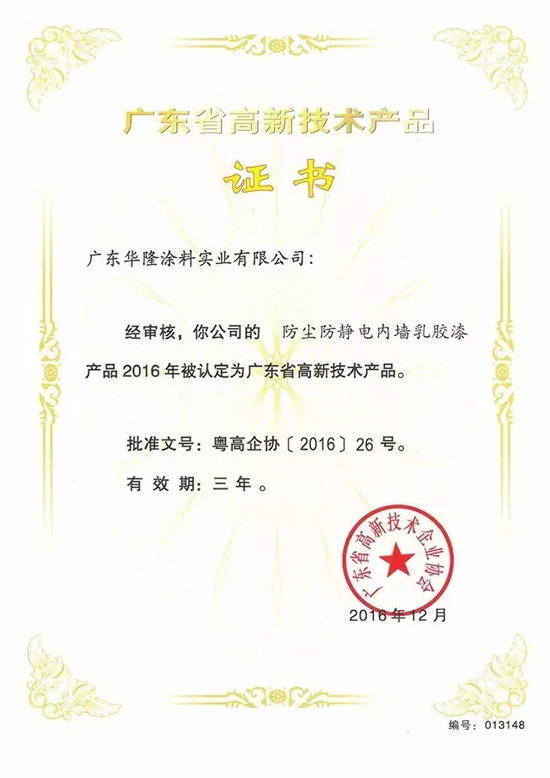 华隆涂料四项产品获“广东省高新技术产品”权威认定 高新技术产品是经过国家授权部门的认定或经市场检验并得到认可的拥有自主知识产权、创新性强、技术含量高、市场竞争力强,能形成自主品牌的新产品,产品生产原料及技术装备有保障,市场潜力大,有较好的经济效益、社会效益和环境效益,符合可持续发展的要求。 作为国家高新技术企业,华隆涂料拥有23年的专业涂料研发、制造经验,是一家致力于环保及高技术含量产品的生产与研发的中国知名涂料品牌。华隆涂料以“责任高于一切”为品牌理念,坚持“始终将消费者的安全与健康放在第一位”,视质量为企业生命,奉行“开发和应用无毒无害低污染产品”的技术研发宗旨。