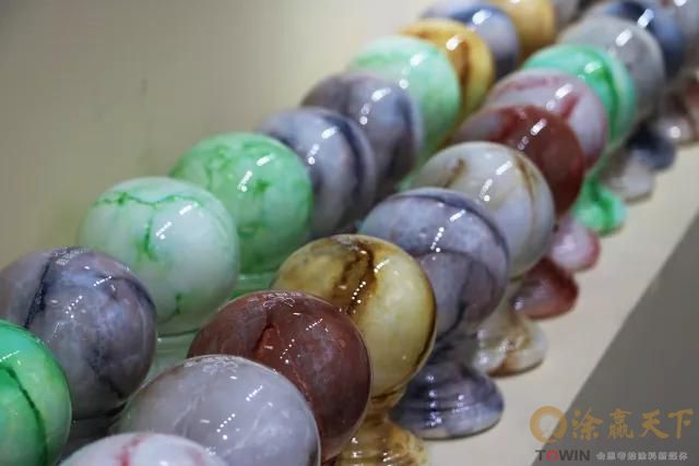 数码彩仿大理石漆涂装效果展示 数码彩展馆正门庞大的大理石背景墙,展馆内摆放着表面涂装有大理石纹理的各种罗马柱、楼梯扶手、圆球、葫芦以及十二生肖,琳琅满目,色彩多样,都是全手工仿天然大理石纹理描绘而成,物华天宝,浑然天成,在整个涂料行业内是首家也是唯一用涂料画出理石纹理的品牌,为大理石涂装开辟了一道新兴工艺。