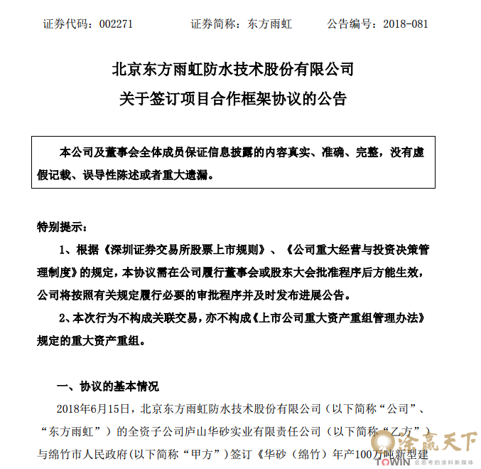 2018年6月15日,东方雨虹的全资子公司庐山华砂实业有限责任公司签订年产100万吨新型建筑材料项目合作框架协议,协议约定乙方拟投资10亿元人民币在四川省绵竹市投资新建年产100万吨新型建筑材料及相关配套项目。