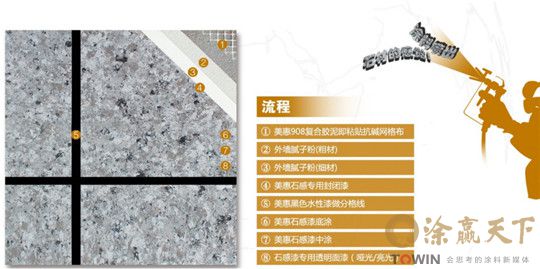 规范涂装体系 美惠石感漆拥有一套科学系统的施工工艺标准,从复合胶泥到面漆施工九大流程,定制型喷涂工具以及配套产品推荐等,形成了完整的产品涂装体系。易于上手,按标准施工即可实现外墙饰面效果最大化。 三分材料,七分施工。师傅手艺是美惠石感漆十分看重的。公司时常组织技术讲座、喷涂技巧交流、施工技艺评比等线上线下活动,并组织技术人员常年下市场,进行一对一教学推广,切实保证外墙施工效果符合涂装标准。 一方面,美惠石感漆注重师傅个人品牌的形成;另一方面,“品质美惠”的观念也深入每个经销商心中,“把每一项工程都当成样板房来建设”是很多经销商的口头语。是他们的积极推介以及与一线师傅的良性互动,让美惠石感漆这个半成品在终端四处开花,硕果累累。