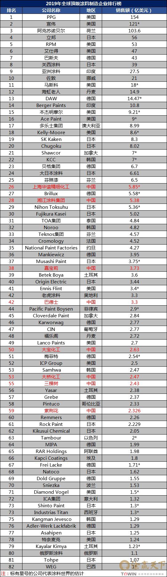 跟2018年的“全球顶级涂料制造企业销售额排行榜”比起来,今年新增加了两家企业:湘江涂料集团和巴德士。另外根据“2019CCR中国顶级涂料排行榜”,涂赢天下网发现,按“年销售额1亿美元(约6.87亿元人民币)”计算,至少还有25中国涂料企业能上榜,包括展辰、美涂士、东方雨虹、富思特、中华制漆、君子兰、晨阳水漆、山东乐化、亚士创能等。 美国化工杂志《涂料世界》(Coatings World)创立于1966年,被誉为全球化工领域内“最具阅读的杂志”。它关注全球领域开发和生产油漆、涂料、胶粘剂和密封剂,并提供全球油漆和涂料行业的新技术,生产和市场营销方面的信息。 从2010年起,《涂料世界》开始推出“全球顶级涂料制造企业销售额排行榜”。据悉,“2019年全球顶级涂料制造企业排行榜”是美国《涂料世界》基于年销售额(以美元计)排名。对于在美国以外的公司,使用公司财政截止日期的汇率将销售额换算为美元。对于选择不披露销售数据的私营公司,美国《涂料世界》则通过采访不同的行业资源以及美国《涂料世界》自己的研究,以准确估算年度销售额(注:标有星号的公司代表涂料世界的估计)。 根据榜单,今年有两家公司被从名单中删除:J.W。Ostendorf和Whitford,前者被海虹老人收购,后者则被PPG收购。今年新增加了六家公司:三家来自德国,一家来自美国,两家来自中国。