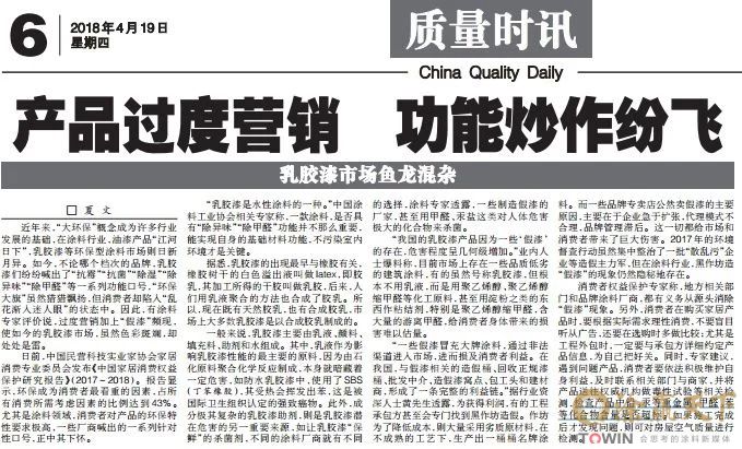 同天,《中国消费者报》也指出,在购买涂料时要根据实际需求理性消费,不要盲目听从广告。尤其要警惕品牌涂料“除异味”“除甲醛”口号下,劣质涂料带来的危害。 报道中提到,乳胶漆主要由乳液、颜料、填充料和助剂组成。其中,乳液作为影响乳胶漆性能的最主要的原料,因为由石化原料聚合化学反应制成,本身就暗藏着一定危害。同时,市场上还存在很多品质低劣的涂料,使用聚乙烯醇、聚乙烯醇缩甲醛等化工原料,含大量的游离甲醛,给消费者身体带来严重损害。 |