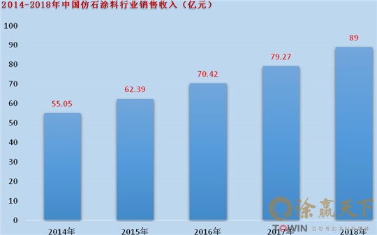 第21届中国(广州)建博会统艺仿石漆展馆现场图 据了解,仿石漆具有仿真度高、石材质感强、装饰性强、使用安全、使用寿命长等一系列优点,目前已成为外墙干挂石材的首选替代品,并受到国内许多知名的一线开发商的认可。 根据中国涂料工业协会统计:2018年全年1336家规模以上企业产量达到1759.79万吨,同比增长5.9%;全年1998家规模以上企业主营业务收入为3268.1亿元,同比增长6.5%;实现利润总额236.48亿元,同比增长5.1%。亏损企业亏损额同比增长27.4%,增速降低17.7%,行业企业应收账款同比增长6.3%,达到607亿元,占全行业主营业务收入的18%。利息支出总额18.69%,这一系列数据说明2018年度行业企业融资难度快速增长。 在行业大背景下不佳的情况下,仿石涂料却是另外一番景象。根据统计数据显示,仿石涂料销售收入随着下游行业需求规模不断扩大而增加,2014年中国仿石涂料收入55.05亿元,2018年中国仿石涂料行业销售收入达89亿元。2014-2018年中国仿石涂料销售收入如下图所示: