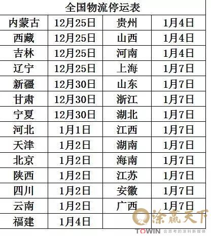 近日,物流部门发布了河北、山东、江苏等27个省份地区春节期间物流停运通知。