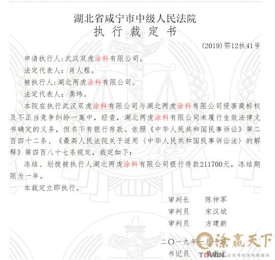 不管事实有多复杂,但事实就是事实。基于清晰的证据,二审法院认定,武汉双虎获得商标保护权益,湖北两虎败诉并赔偿20万。并且在2019年的1月份,该款项由法院发文强制执行,一共冻结划拨湖北两虎的银行资金211700元。