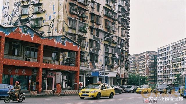 这就是位于九龙坡区的黄桷坪涂鸦艺术街,以黄桷坪铁路医院为起点,终点是501艺术库,道路两旁的建筑楼全被涂鸦上,画面斑斓连贯,犹如一幅巨画,它的长度有1.25公里,这长度造就它成为“世界上最长的涂鸦街”,也是“全世界最大的涂鸦艺术作品群”。