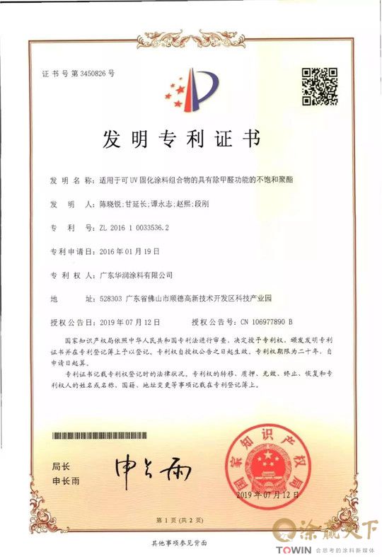 荣获“适用于可UV固化涂料组合物的具有除甲醛功能的不饱和聚酯”中国发明专利(专利号:ZL 201610033536.2)