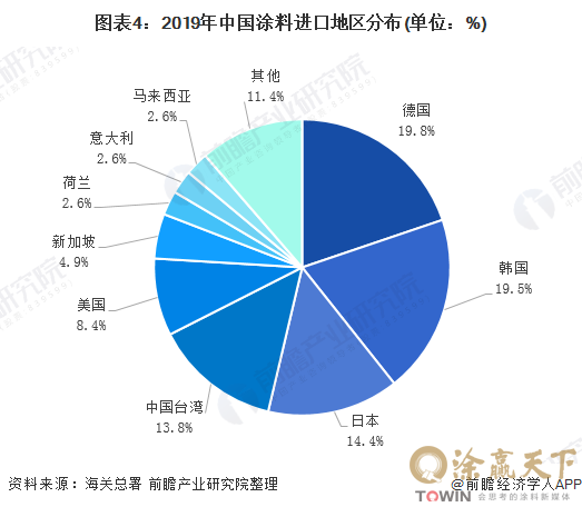 涂料进口主要来自德国、韩国、日本、中国台湾等地区,2019年,来自德国、韩国、日本地区涂料进口量占中国涂料进口的19.8%、19.5%和14.4%。
