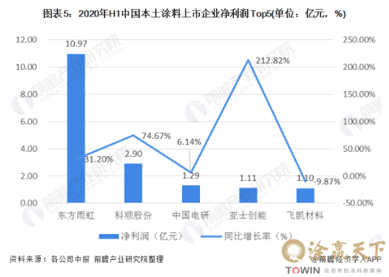 2020年上半年,中国本土涂料上市企业中,东方雨虹营业收入最高,达到了87.83亿元,遥遥领先于其他企业;其次是科顺股份和三棵树,营业收入分别为26.59亿元和25.95亿元。2020年上半年中国本土涂料上市企业营收Top5中,科顺股份营业收入同比增幅最大,达到了34.70%;而中国电研却实现负增长,上半年营业收入为10.86亿元,同比下降21.76%。