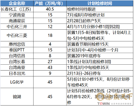 科思创、乐天化工、LG化工、上海三菱、中石化三菱等国内外企业在本年度安排了长达一个多月的停车检修计划。