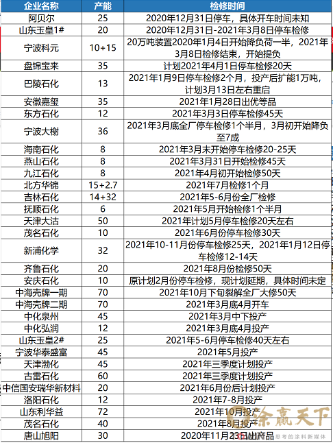 涂赢天下讯:近期,化工行业可谓是“一波未平一波又起”。不仅原材料价格飞涨,而且由于事故或不可抗力等,茂名石化、山东金岭、鲁西化工等近百家化工企业宣布装置停车,涉及到PE、有机硅、丁二烯、苯乙烯、双酚A等众多化工品。这些企业有的是部分装置检修,还有的是全停检修,且周期普遍偏长,基本在10-50天之间。众多知名大厂的停车,将导致供给端产能急剧缩减,使得原本就供需失衡的化工市场雪上加霜,价格更是逐渐看涨。
