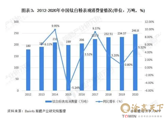 钛白粉是一种重要的无机化工产品,供给方面,2010-2020年我国钛白粉产量整体呈现连续上涨趋势,其中金红石型钛白粉产量占比最大;需求方面,我国钛白粉表观消费量也呈现增长趋势,其中涂料、塑料行业是主要需求来源。未来在下游需求带动的背景下,钛白粉市场规模有望稳中带增发展。行业相关公司:龙蟒佰利(002601)、中核钛白(002145)、金浦钛业(000545)、山东东佳、攀钢钛业、金海钛业、济南裕兴、龙口道恩、宁波新福等本文核心数据:中国钛白粉产量、中国钛白粉细分产品产量占比、中国钛白粉表观消费量等钛白粉主要成分为二氧化钛(TiO2)的白色颜料,学名为二氧化钛,分子式为TiO2是一种多晶化合物,其质点呈规则排列,具有格子构造。钛白粉是一种重要的无机化工产品,在涂料、油墨、造纸、塑料橡胶、化纤、陶瓷等工业中有重要用途。在我国钛白粉产量方面,据国家化工行业生产力促进中心钛白分中心和钛白粉产业技术创新战略联盟秘书处统计,2020年全国所有42家全流程型钛白粉生产企业的各类钛白粉及相关产品综合产量为351.2万吨,比上年增加33万吨,增幅为10.39%。从2020年钛白粉细分产品产量占比来看,在351.2万吨总产量中,金红石型钛白粉为285.6万吨,占比为81.31%;锐钛型钛白粉为53.8万吨,占比为15.33%;非颜料级钛白粉为6.0万吨,占比为1.71%;催化和功能材料钛白粉为5.8万吨,占比为1.65%。近几年全球二氧化钛需求持续保持高速增长,随着全球二氧化钛市场不断细分,需求增幅更大。近年来,我国钛白粉表观消费量呈波动增长趋势,2011年表观消费量为164万吨,2012年,受钛精矿产量下降的影响,我国钛白粉产量增速有所下降,表观消费量达180万吨左右,较上年同比增长9.76%。2015-2020年,我国钛白粉市场表观消费量呈现出波动上升的趋势,2020年钛白粉表观消费量为246.8万吨,较上期增长5.32%。在下游消费结构方面,据统计,2020年我国钛白粉消费中有61%用于涂料行业中,占所有消费类别比例最大;其次是塑料行业,消费占比约为18%;造纸行业的钛白粉消费占比为10%,位列第三;其余行业如油墨、橡胶行业的钛白粉消费比例则较小。经过20余年的高速发展,我国钛白粉行业的规模和产品质量得到全面提升。钛白粉是种多用途型的化工产品,其发展不但受原料、环保的影响,也受到下游和相关领域的影响,因此根据我国房地产、汽车行业等钛白粉的主要下游行业的发展前景来看,市场在调整里稳中向好将是常态化趋势。预计2021-2026年我国钛白粉的市场会小幅度稳步增长,到2026年消费量增长到约292万吨。(来源:前瞻网)