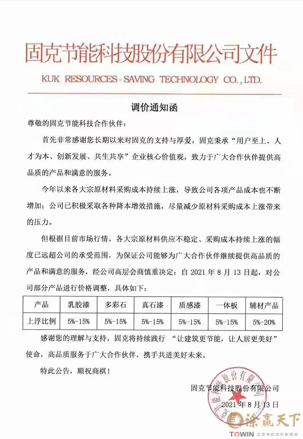 亚士创能、三棵树、美涂士、固克发出产品调价函