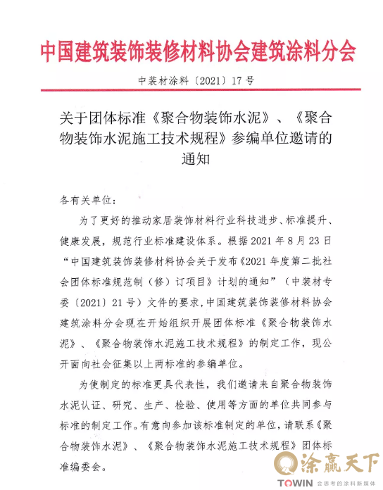 为了更好的推动家居装饰材料行业科技进步、标准提升、健康发展,规范行业标准建设体系。根据2021年8月23日“中国建筑装饰装修材料协会关于发布《2021年度第二批社会团体标准规范制(修)订项目》计划的通知”(中装材专委〔2021〕21号)文件的要求,中国建筑装饰装修材料协会建筑涂料分会现在开始组织开展团体标准《聚合物装饰水泥》、《聚合物装饰水泥施工技术规程》的制定工作,现公开面向社会征集两个标准的参编单位。