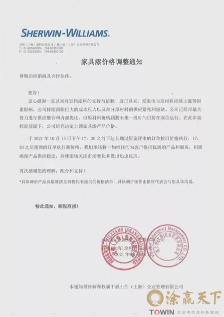 2021年10月15日,威士伯(上海 )企业管理有限公司发出家具漆价格调整通知,021年10月15日下午17:30之前下达且通过资金评审的订单按旧价格执行,17:30之后接到的订单执行新价格。