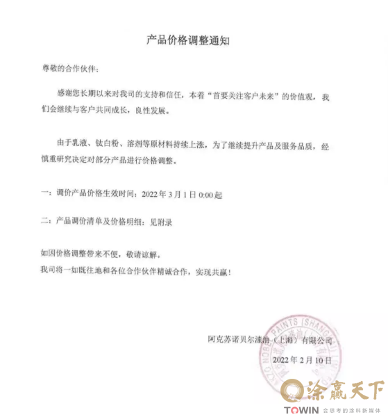 2022年2月10日,阿克苏诺贝尔漆油(上海)有限公司发布产品价格调整通知,调价产品价格生效时间于2022年3月1日0:00起。