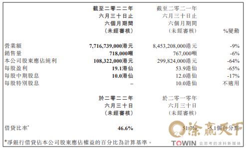 回顾期内,涂料业务销售额达到8.8亿港元,按年下滑10%。二零二二年上半年, 全国各地受疫情影响,涂料产品的需求整体下滑。再者,集团位于上海金山的厂 房供应于四至五月期间不稳定,影响供货效率。另外,房地产市场需求淡,影响 了集团与建筑和居住相关的建筑及家具涂料销售。