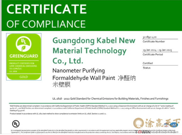 近日,卡百利产品获得美国绿色卫士GREENGUARD金级认证。