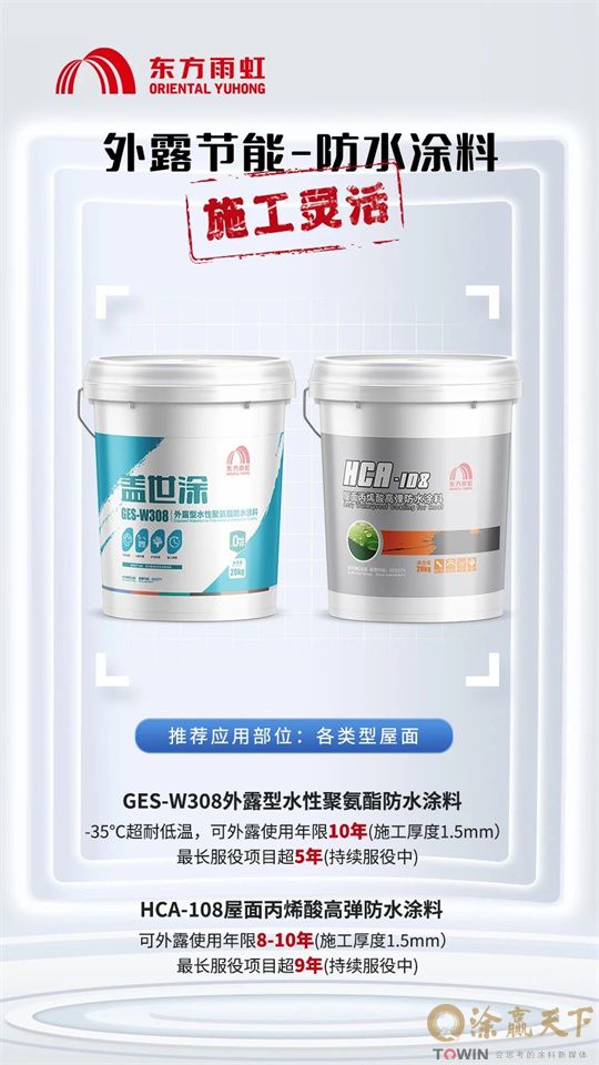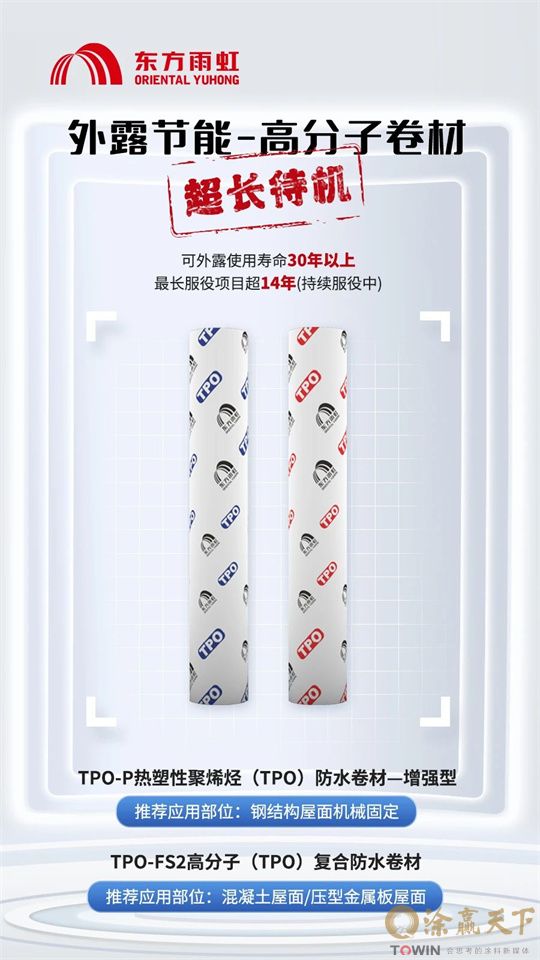 结合白色功能特点、屋面工程需求特点以及行业发展趋势,东方雨虹以高能级科创平台为支撑,相继推出TKB-530太空堡屋面节能聚合物改性沥青防水卷材、TKB-220/210太空堡超耐候自粘沥青防水卷材、GES-W308外露型水性聚氨酯防水涂料、HCA-108屋面丙烯酸高弹防水涂料、TPO-FS2高分子(TPO)复合防水卷材、TPO-P热塑性聚烯烃(TPO)防水卷材—增强型等多款外露白色节能防水产品,高效实现“降温、节能、防水、装饰”四位一体,在降低室内温度、制冷能耗的同时,降低碳排放,缓解城市热岛效应。