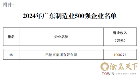 涂赢天下讯:2024年12月3日,广东省制造业协会、暨南大学产业经济研究院、广东省发展和改革研究院联合发布《2024年广东制造业500强企业研究报告》,巴德富集团有限公司上榜“2024年广东省制造业企业500强”。从区域分布看,佛山入选企业最多,数量为102家;其次为深圳93家、江门64家、广州58家、东莞52家、珠海42家。紧随其后的是第二梯队的惠州、揭阳、中山,入选企业数量均在10—30家之间。位居第三梯队的是肇庆、清远、云浮,入选企业数量均少于10家。该榜单以企业年度营业收入为主要依据。总的来看,500强企业营收水平有所下降,营业收入合计达5.32万亿元,比2023年减少4.9%;平均营业收入106.52亿元,比2023年减少4.9%。巴德富集团创立于2000年,经过24年稳健发展,如今已成为了一家拥有“1个总部+8大生产基地+2大创新研发中心”的国家高新技术企业,也是目前亚洲最大的水性乳液研、产、销一体化企业。今年,巴德富集团作为唯一乳液品牌,以品牌价值325.55亿元成为连续五年蝉联“中国500最具价值品牌”的企业。未来,巴德富将继续以创新为引领,大力发展新质生产力,不断提升企业综合实力,为广东经济高质量发展贡献一份力量。