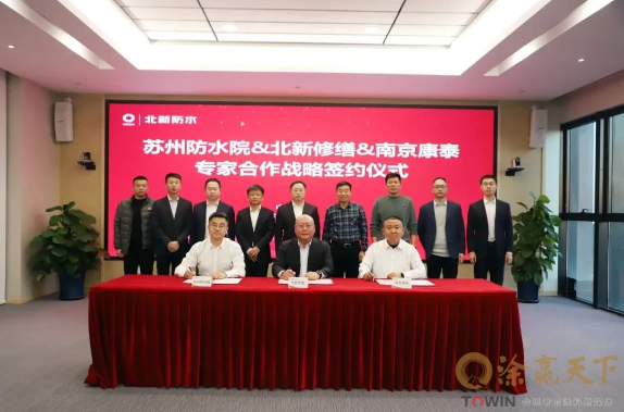 涂赢天下讯:2025年1月10日,北新防水与中建材苏州防水研究院有限公司(下称苏州防水研究院)、南京康泰建筑灌浆科技有限公司(下称南京康泰)专家合作战略暨北新修缮南京运营中心签约仪式在北新防水总部举行。北新防水临时党委书记、董事长、总经理张弘,苏州防水研究院执行院长沈春林出席签约仪式。北新防水修缮业务部副总经理(主持工作)陈中辉与南京康泰董事长陈森森签署北新修缮南京运营中心合作协议;随后陈中辉与苏州防水研究院院长助理王玉峰、南京康泰董事长陈森森分别代表公司签署专家合作战略协议。北新防水副总经理白宏成、天津天大天海新材料有限公司(下称天津天大天海)总经理李亚军见证签约。座谈中三方就全面深化合作进行了充分沟通,未来将就产业链协同、产品创新、技术研发等方面积极开展深入协同合作和优势互补。依托北新防水在防水行业的产业优势、丰富的全系列产品供应以及苏州防水研究院、南京康泰的平台、技术、项目等优势,实现业务互补与资源共享,为对方资源对接、项目拓展、业务发展等形成助力和支撑,实现互惠互利、共赢发展。此次签约是公司携手苏州防水研究院及修缮合作客户,深度推进 “一体两翼”经营战略协同,全力践行“四个转变”,创新驱动市场服务升级的重要举措。同时标志着北新修缮首家运营中心成功落户南京,北新修缮正式启动在全国的战略招商布局,必将引领国内城市更新新局面。会前,南京康泰、苏州防水研究院、天津天大天海一行共同参观了北新建材“绿色科技 品质生活”展厅、北新建材绿色示范大楼、党史学习教育数字化教学基地、院士工作站等,深入了解了北新建材“全生命周期全产业链”绿色发展理念。南京康泰董事长助理祁兆亮;天津天大天海总经理助理贾海蓉;北新防水总工办常务副总工程师杨德亮,修缮业务部运营经理宋长侠,北方公司应用技术经理白宇,修缮业务部技术主管王东来,北方公司应用技术经理范建军等参加签约仪式。