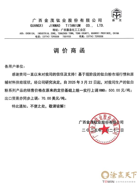 涂赢天下讯:近日,龙佰集团、道恩钛业、中核钛白、惠云钛业等11家钛白粉生产企业先后发布调价函,宣布国内销售价格上调500元/吨,国际市场上调70美元/吨。这是年内第三次集体涨价,标志着行业在成本压力与供需结构调整下的持续上行趋势。目前,国内硫酸法金红石型钛白粉主流报价已升至15000-16000元/吨,氯化法产品价格区间达18500-21000元/吨(含税出库)。业内普遍认为,短期内原料价格高位运行的态势难改,钛白粉企业涨价意愿持续。随着科慕等国际巨头宣布4月亚太地区提价100美元/吨,国内市场或形成内外联动的涨价格局。此次调价不仅是行业应对成本压力的短期策略,更是钛白粉产业链深度调整的缩影。在环保趋严、原料全球化波动及下游需求转型的背景下,行业整合与技术升级的步伐或将进一步加快。