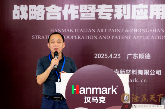 在技术创新方面,汉马克艺术涂料始终将技术创新作为企业发展的核心驱动力,通过持续加大研发投入、深化技术积累、突破创新瓶颈,构建起以技术创新驱动发展的战略格局。2025年4月23日,意大利汉马克艺术涂料&中山大学战略合作签约仪式暨专利应用学术沙龙在汉马克(中国区)运营中心总部隆重举行,本次校企合作标志着汉马克艺术涂料在技术创新方面迎来新突破!通过与国内顶级高校的战略合作,汉马克艺术涂料未来将强化产品品质升级,并切实将技术创新成果转化为艺术涂料行业高质量发展的磅礴动力。据了解,出席本次活动的嘉宾包括:中国建筑装饰装修材料协会副会长助理贤冬、顺德涂料商会会长罗宇、中山大学化学工程与技术学院讲师/广东省浓缩洗涤剂工程技术研究中心主任曾晖教授、《艺术涂料内参》创始人肖武、汉马克中国区董事长李东明、汉马克中国区副总裁黎玉兰等等,与汉马克中国团队共同见证了这一重要时刻。会上,汉马克中国区副总裁黎玉兰女士在开场致辞中表示,自2022年进入中国市场以来,意大利汉马克艺术涂料始终秉持“定制·更精致”理念,融合东西方美学精髓,打造兼具艺术性与功能性的高端涂料产品,从选材到工艺全程严苛把控,以“小而美”的产品策略,让每面墙都成为艺术珍品。黎玉兰女士强调,汉马克艺术涂料与中山大学的强强联合,将依托高校顶尖科研力量,为产品注入创新动能。这不仅是技术的升级,更是对“健康美学”生活方式的重新定义。未来,汉马克将继续以匠心工艺与前沿科技,为中国消费者带来更安全、更艺术的空间解决方案。顺德涂料商会会长罗宇则在致辞中表示,如今,艺术涂料已成为内墙涂料市场“高端”的代名词,这一变化,离不开顺德从事艺术涂料行业每一个企业家的更努力。这么多年,从汉马克(中国区)董事长李东明身上,可以看到他的执着,他的坚持,他的热情,他的热爱。中国建筑装饰装修材料协会建筑涂料分会副秘书长贤冬在致辞中表示,在当前全球经济动荡、外部环境不确定的背景下,中国通过扩大内需抓住了重要发展机遇。国家通过提振消费、稳定房地产和股市以增强居民消费信心,同时采取“双轮驱动”策略(新基建、旧改),这为涂料等行业带来新需求。此类市场对产品和工艺要求较高(如防霉除味等),需要企业以技术创新和优质产品应对。在此历史机遇下,企业需联合上下游供应链协同创新,实现共赢发展。而汉马克艺术涂料正积极布局,希望通过技术突破和校企合作,在行业变革中发挥更大作用。战略合作签约现场,在全场嘉宾的共同见证下,汉马克(中国区)董事长李东明与中山大学化学工程与技术学院讲师/广东省浓缩洗涤剂工程技术研究中心主任曾晖教授共同签署了战略合作协议。