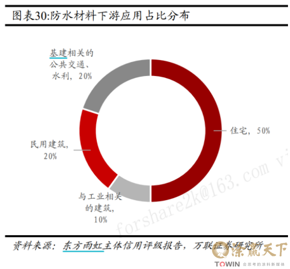 防水材料在住宅中的应用占比较大,2022年占比50%。