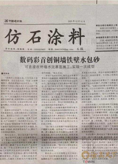 本文原载于《中国建材报》12月11日6版《数码彩首创铜墙铁壁水包砂 |可直接在外墙水泥基面施工,实现一次成型》,作者:陶璐璐