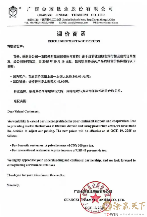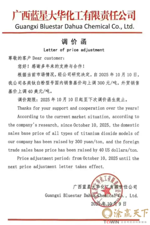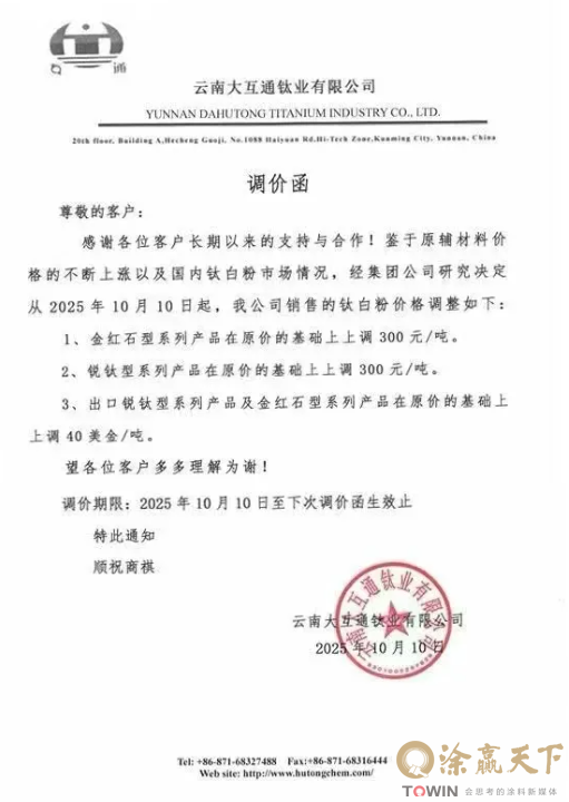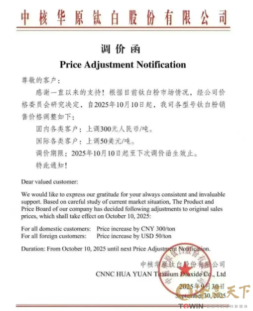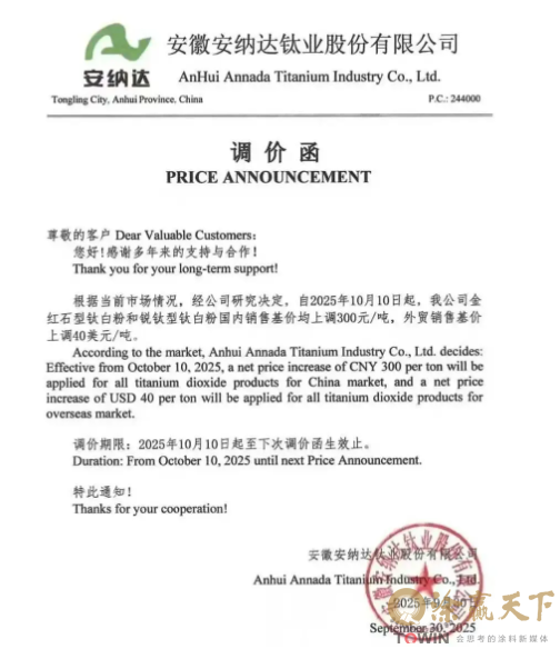 安纳达调价函明确,自10月10日起,金红石型钛白粉和锐钛型钛白粉国内均上调300元/吨,外贸上调40美元/吨。