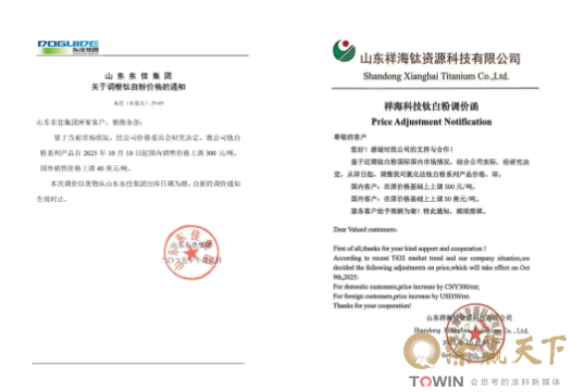 事实上,十一国庆假期还未结束,钛白粉行业的涨价再来一波。山东东佳集团与山东祥海钛资源科技同时发布调价通知,山东东佳集团明确自10月10日起,钛白粉国内上调300元/吨,国外上调40美元/吨;山东祥海钛资源科技针对氯化法钛白粉系列产品,宣布从10月9日起,国内上调300元/吨,国外上调50美元/吨。
