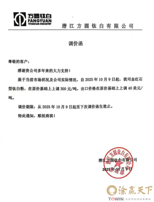 潜江方圆钛白宣布,10月9日起,金红石型钛白粉上调300元/吨,出口价格上调40美元/吨。
