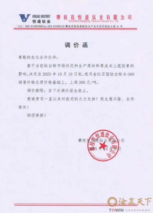 攀枝花恒通钛业宣布,10月10日起,金红石型钛白粉上调300元/吨。