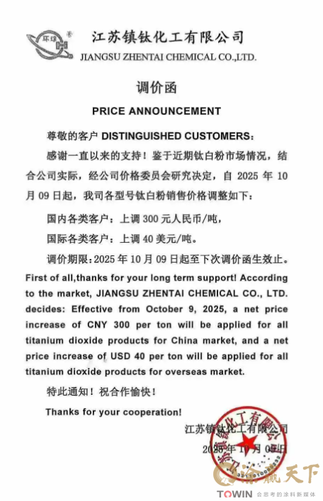 江苏镇钛化工宣布,10月9日起,国内客户上调300元/吨,国际上调40美元/吨。