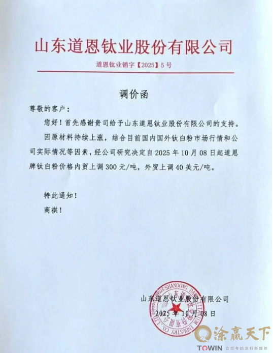 道恩钛业宣布,10月8日起,道恩牌钛白粉内贸上调300元/吨,外贸上调40美元/吨。