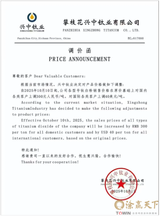 攀枝花兴中钛业宣布,10月10日起,各型号钛白粉价格国内上调300元/吨,国际上调40美元/吨。