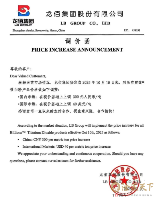 这并非孤例,自9月底以来,龙佰集团、攀枝花海峰鑫化工、鲁北化工旗下企业、攀枝花兴中钛业、安纳达、中核华原钛白等多家头部厂商相继跟进,形成一波集体涨价浪潮,国内市场调价幅度普遍锁定300元/吨,国际市场上调40-50美元/吨不等,行业试图通过协同调价缓解盈利压力,迎接传统“银十”旺季。