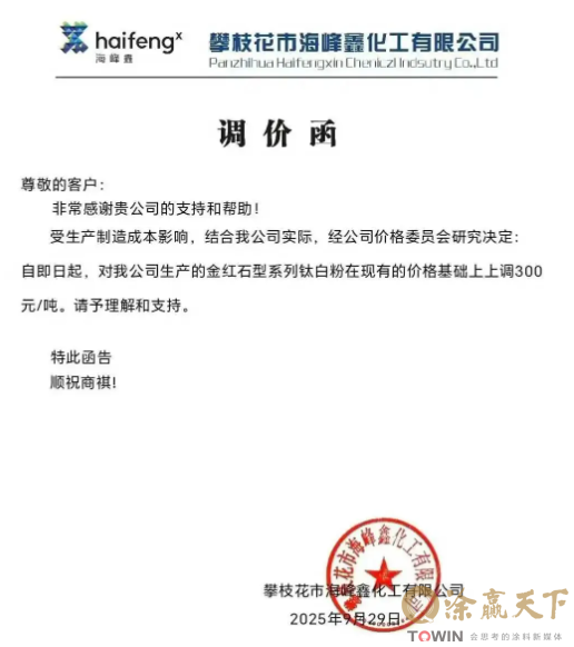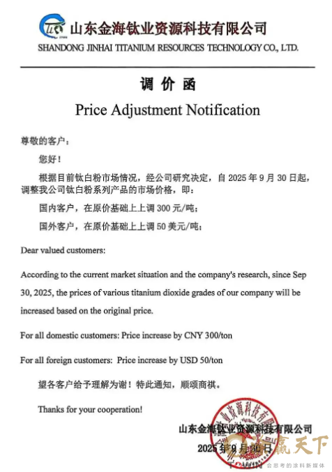 山东金海钛业宣布,9月30日起调整钛白粉系列产品市场价格,国内上调300元/吨,国外上调50美元/吨。