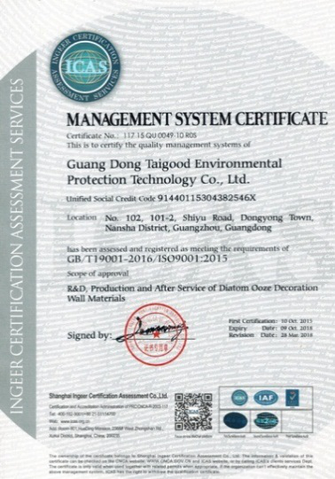 质量管理体系认证证书 5月真是喜事连连,先是太氧谷通过国家高新技术企业认定,接着今日又传捷报,太氧谷硅藻泥连获三项ISO认证。那么,ISO是什么呢?有什么作用呢?很厉害吗?太氧谷小编在这里为你一一解答唷。 ISO9001质量管理体系的目的是什么? 1、证实公司产品或服务有能力满足顾客需要; 2、不断提高公司质量管理以增强顾客满意。 什么是ISO9001:2015质量管理体系? ISO9001:2015质量管理体系要求是国际标准化组织TC/176技术委员会制定的所有国际标准中核心标准,规范企业产品和服务质量,持续改进公司。 n 质量=时间+数字+本性+服务。 通过ISO9001:2015认证标志着什么? ISO9001:2015质量管理体系认证既是在国家或世界范围内对产品质量的认可,更是对该企业管理体系规范性的一种认可,其认证的严格性及通过认证的难度可想而知。太氧谷作为建材行业内通过该认证的企业,标志着太氧谷获得了进入建材领域的绿色通行证,为公司积极开拓国内国际市场奠定了坚实的基础,为企业发展提供了有力保障。 环境管理体系认证是指由第三方公证机构依据公开发布的环境管理体系标准(ISO14000环境管理系列标准),对供方(生产方)的环境管理体系实施评定,评定合格的由第三方机构颁发环境管理体系认证证书,并给予注册公布,证明供方具有按既定环境保护标准和法规要求提供产品或服务的环境保证能力。通过环境管理体系认证,可以证实生产厂使用的原材料、生产工艺、加工方法以及产品的使用和用后处置是否符合环境保护标准和法规的要求。 太氧谷顺利通过认证ISO4001环境管理体系的严苛认证,意味着企业的综合管理体系步入了标准化、规范化的高水平阶段。未来,太氧谷硅藻泥在给人们提供高品质健康空间的同时,也会为全球环境治理、生态保护贡献一臂之力。