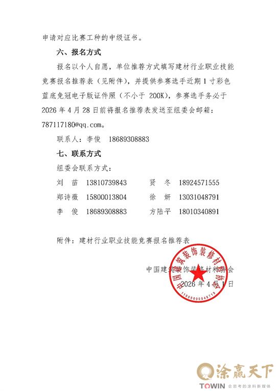 填写《建材行业职业技能竞赛报名推荐表》,附1寸蓝底免冠电子照(≥200K)、身份证及现有技能证书复印件,于4月28日前发送至组委会邮箱:787117180@qq.com。