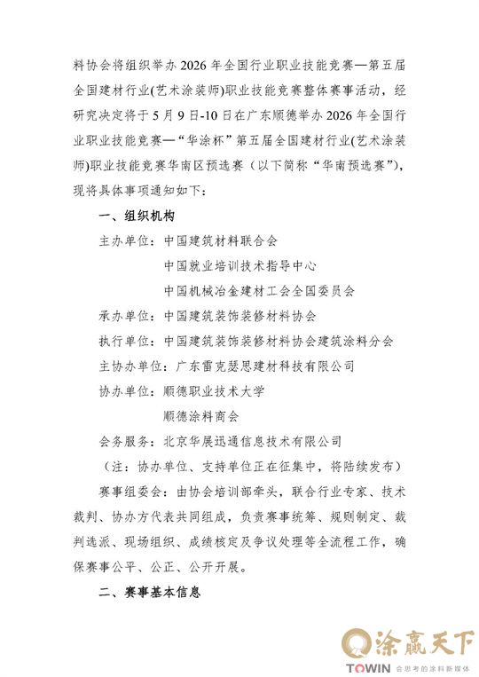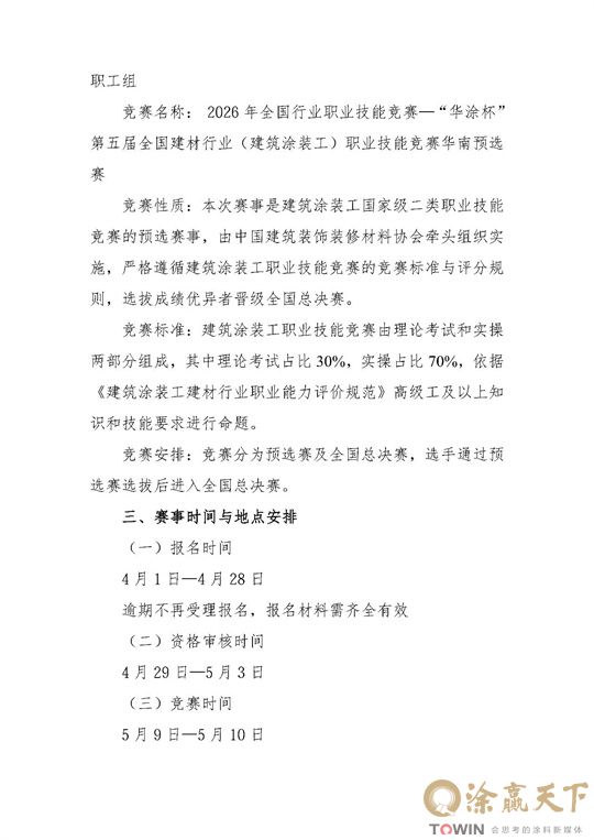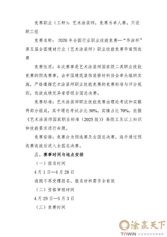 涂赢天下讯:国家级二类职业技能竞赛重磅落地华南!2026年全国行业职业技能竞赛——“华涂杯” 第五届全国建材行业(建筑涂装工/艺术涂装师)职业技能竞赛华南预选赛正式官宣,5月9-10日在广东顺德职业技术大学燃情开赛,现面向全行业公开招募技能精英!