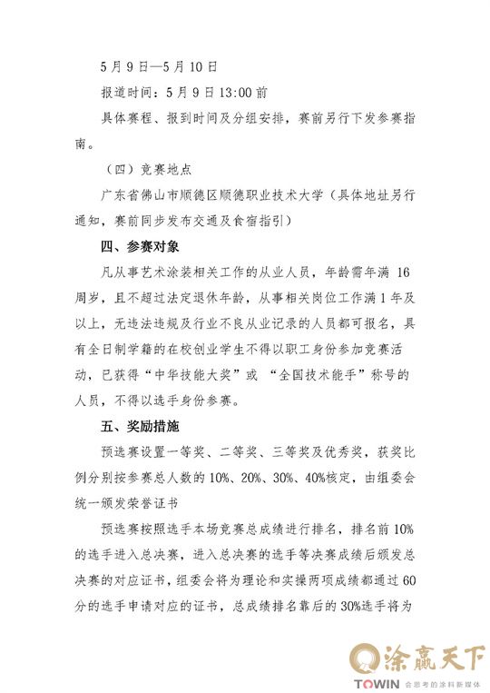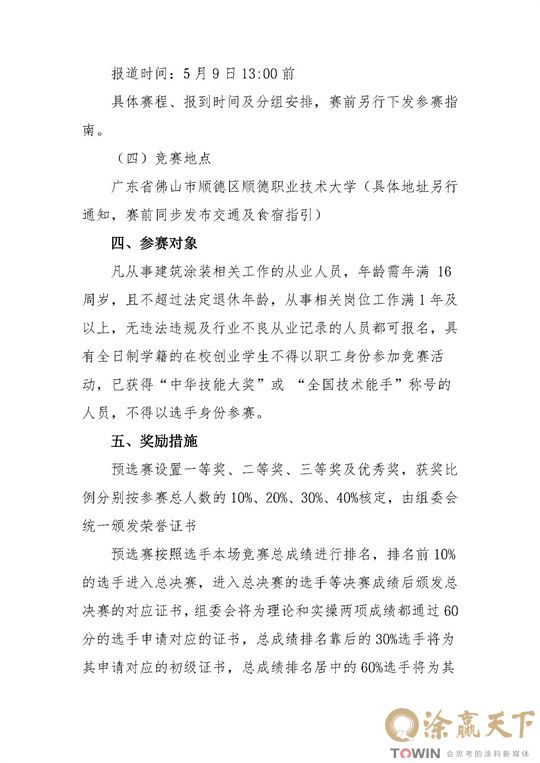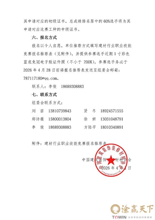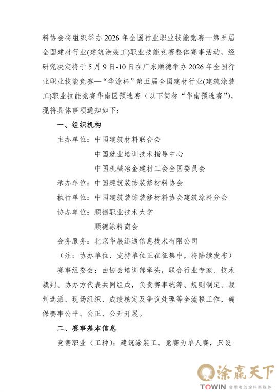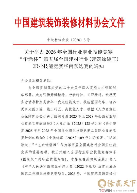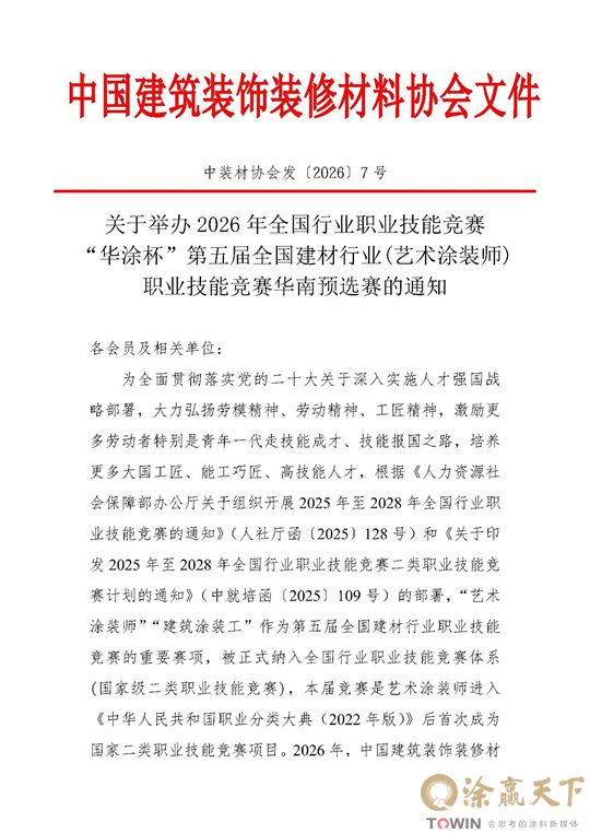 涂赢天下讯:国家级二类职业技能竞赛重磅落地华南!2026年全国行业职业技能竞赛——“华涂杯” 第五届全国建材行业(建筑涂装工/艺术涂装师)职业技能竞赛华南预选赛正式官宣,5月9-10日在广东顺德职业技术大学燃情开赛,现面向全行业公开招募技能精英!本次赛事是建筑涂装工、艺术涂装师纳入《中华人民共和国职业分类大典(2022年版)》后,首次以国家级二类职业技能竞赛身份亮相,含金量拉满、权威性拉满、职业价值拉满,堪称涂装行业的 “技能全运会”。赛事由中国建筑材料联合会、中国就业培训技术指导中心、中国机械冶金建材工会全国委员会联合主办,中国建筑装饰装修材料协会承办,中国建筑装饰装修材料协会建筑涂料分会执行,顺德职业技术大学、顺德涂料商会等单位鼎力支持,全程公平、公正、公开,为行业选拔真正的能工巧匠。竞赛工种:建筑涂装工、艺术涂装师(均为单人赛,仅限职工组)考核标准:理论30%+实操70%,严格对标高级工及以上国家职业标准参赛门槛:年满16周岁、相关岗位满1年、无不良从业记录,全日制在校学生、已获全国技术能手等荣誉者不可参赛荣誉加持:预选赛设一、二、三等奖及优秀奖,按10%、20%、30%、40%比例颁发官方证书国赛直通:总成绩前10%晋级全国总决赛,冲刺更高荣誉证书直达:双科及格即可申领对应等级证书;排名后30%获初级证书,中间60%获中级证书,一赛多得,职业晋升一步到位填写《建材行业职业技能竞赛报名推荐表》,附1寸蓝底免冠电子照(≥200K)、身份证及现有技能证书复印件,于4月28日前发送至组委会邮箱:787117180@qq.com。以匠心守初心,以技能赢未来!这场国家级涂装盛宴,是展示技艺、交流提升、职业进阶的黄金平台。无论你是深耕多年的老师傅,还是崭露头角的新生代,都能在这里绽放光彩、实现价值。赶快报名,5月顺德,不见不散!